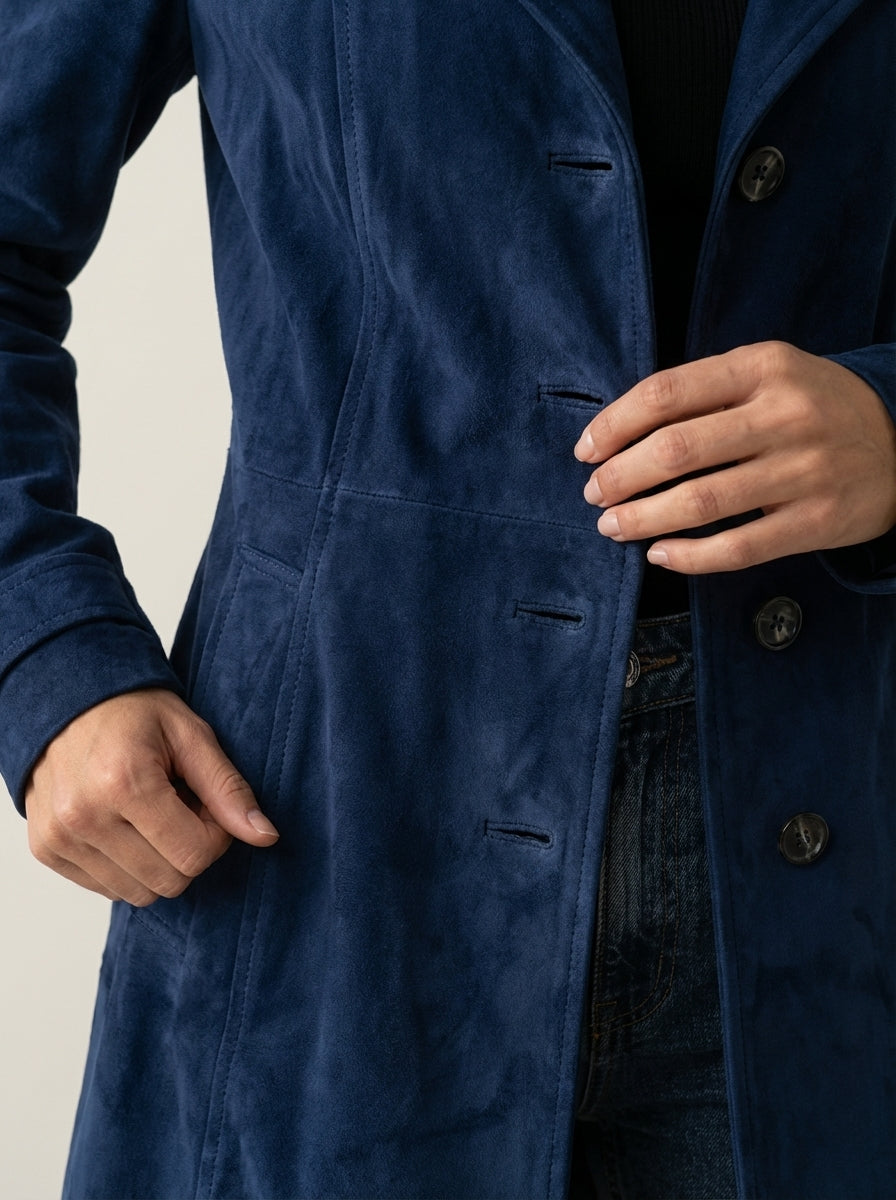 Teresa es un trench de ante que combina un corte clásico con un material suave y agradable al tacto. Su diseño sencillo y elegante hace que el abrigo se adapte perfectamente a la silueta y encaje con facilidad tanto en looks diarios como en estilismos más formales.